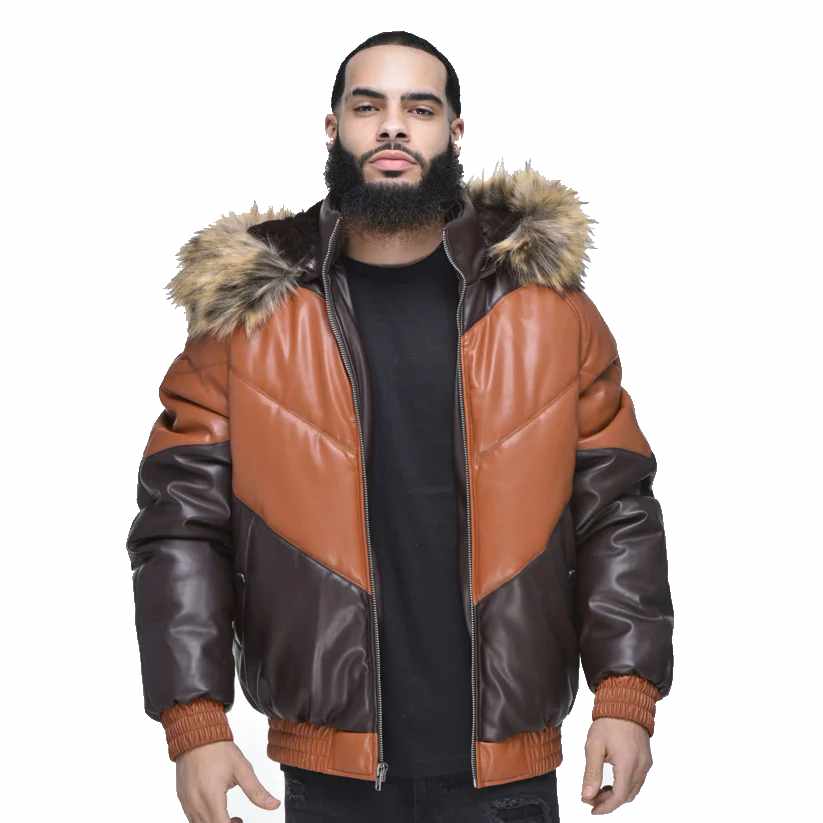 Men’s Faux Leather V Bomber Jacket With Detachable Faux Fur Hood
