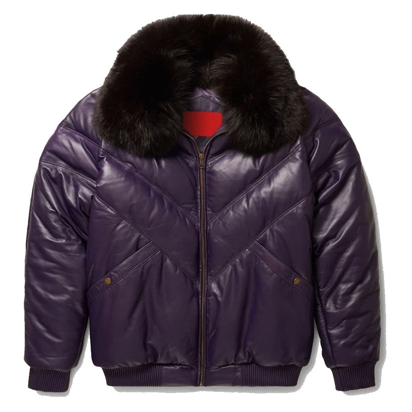 Men’s Stylish Purple V-Bomber Leather Jacket with Fur Collar