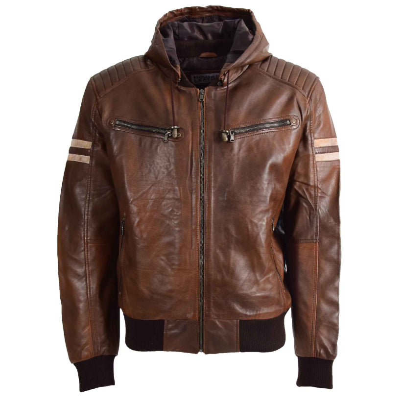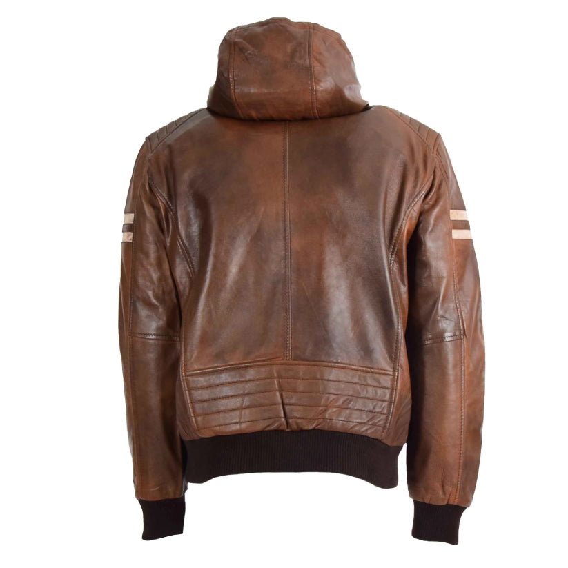 Mens Brown Leather Bomber Hoodie Jacket