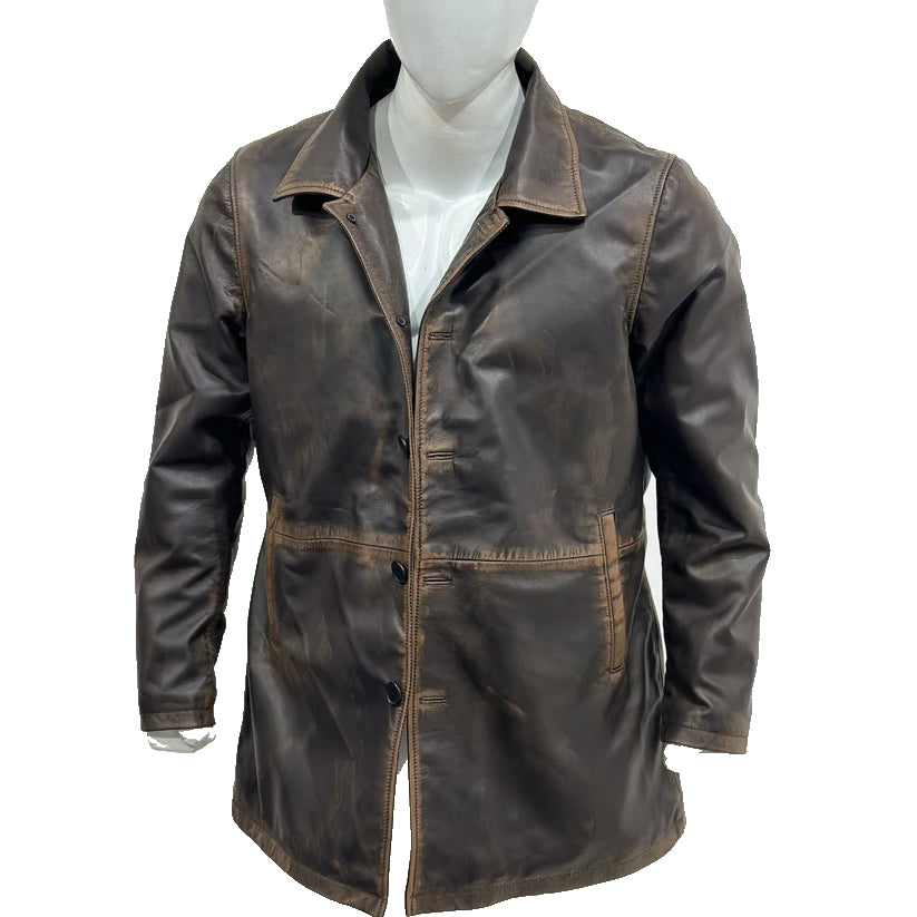 Keep warm this season in this men's brown leather trench coat. Made with leather, this coat offers a classic look and features a comfortable fit, double-breasted closure, and adjustable collar. Perfect for formal and everyday occasions.