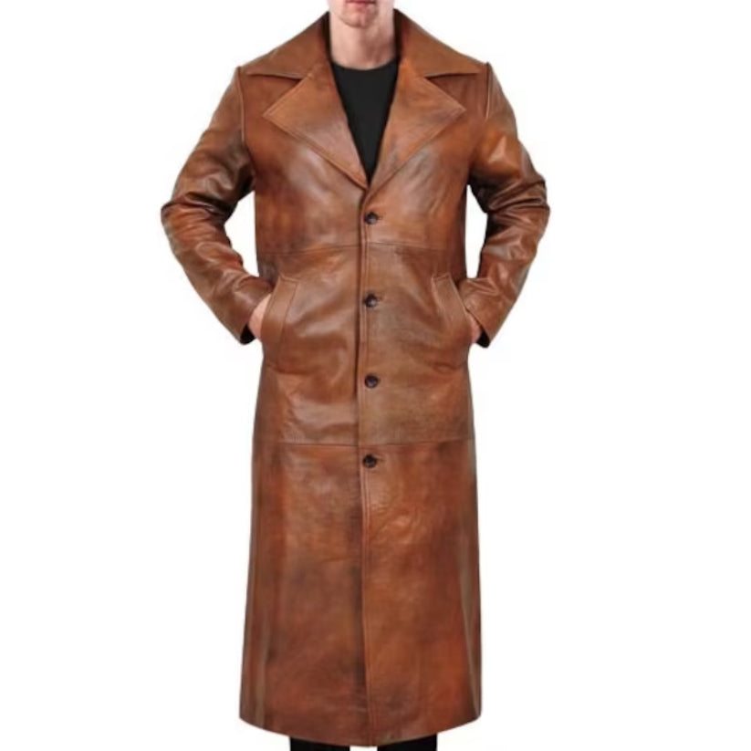 Stay warm and stylish in this Men's Leather Duster Coat. Crafted with quality leather and designed with a luxe fit, it's perfect for keeping out the cold while looking sharp. Perfect for the modern gentleman.