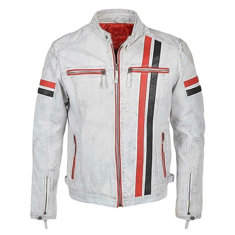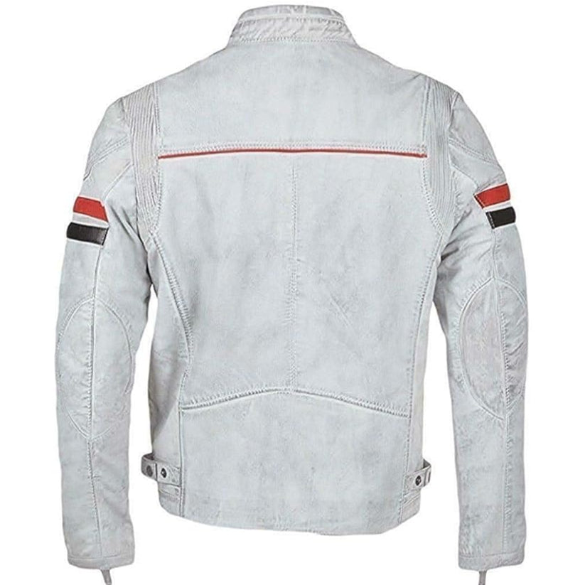This vintage inspired white and red leather jacket for men adds a touch of retro style to your wardrobe. Made with genuine leather, it offers a timeless look and durability. The classic biker design gives off a cool and edgy vibe. Perfect for those who appreciate quality and fashion.