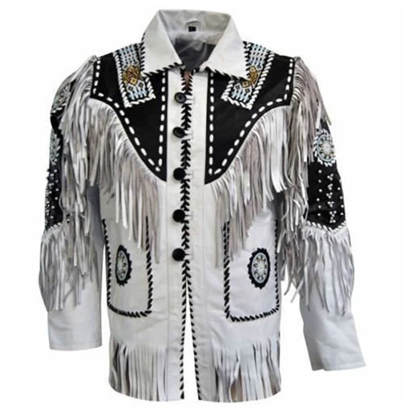 Men's Western Cowboy Leather Jacket with Fringes & Beads