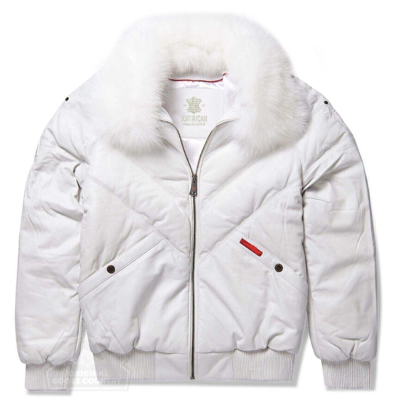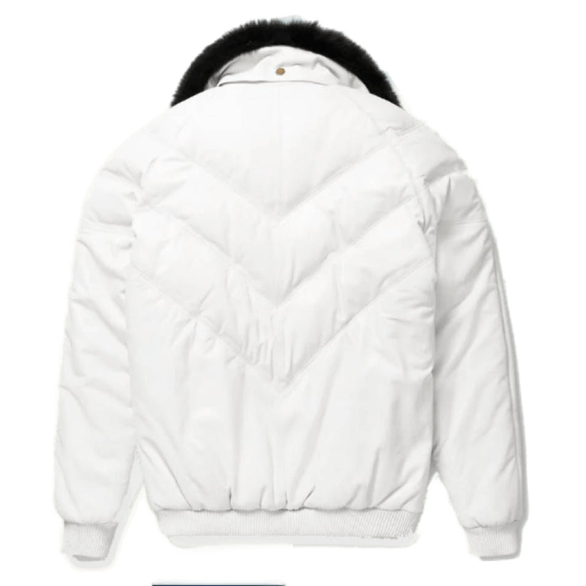 Men's White Lambskin V Bomber Leather Jacket with Fox White Fur Collar