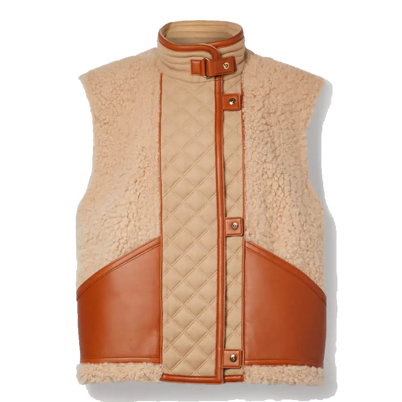 This quilted leather trimmed shearling vest is the perfect blend of fashion and function. With its sleek design and durable construction, it provides both style and warmth for any occasion. The quilted leather adds a touch of sophistication while the shearling lining keeps you comfortably cozy. Stay chic and cozy in this must-have vest.