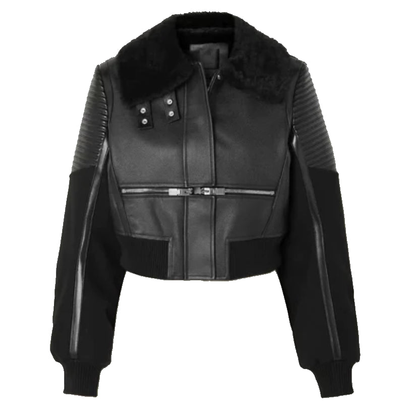 This aviator-style leather jacket is perfect for women seeking both style and warmth. Made with black shearling for a sleek and chic aesthetic, this jacket provides undeniable comfort while also keeping you toasty during colder months. Elevate your wardrobe with this must-have essential.