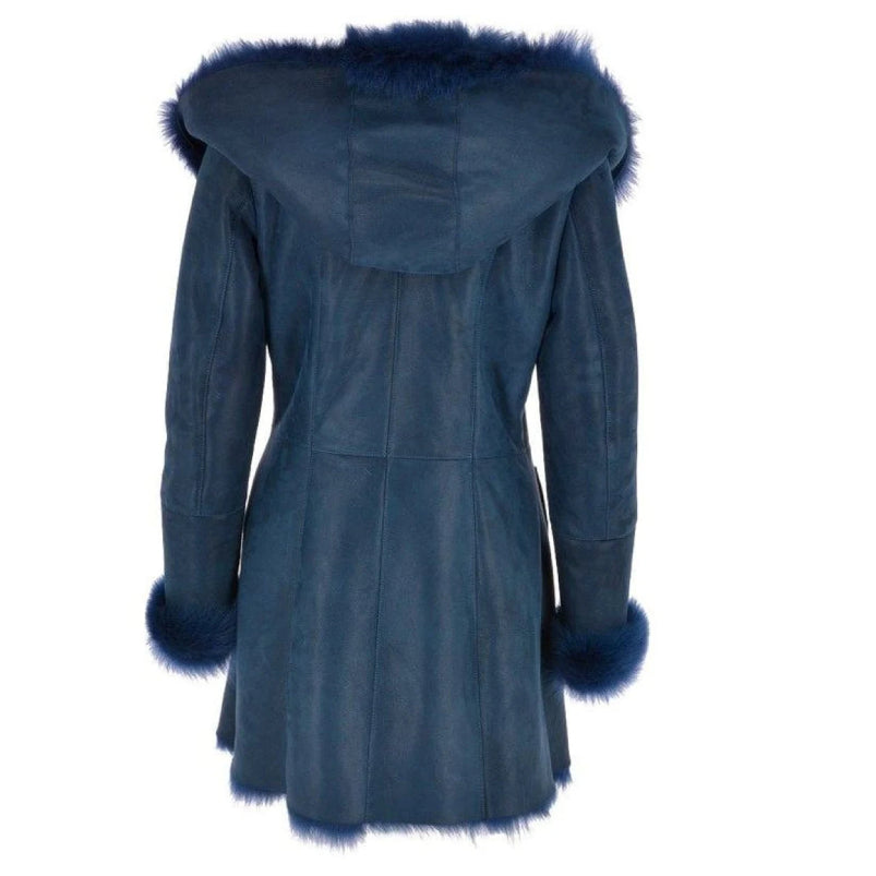 Women's Luxury Sheepskin Royal Blue Fur Hoodie Coat